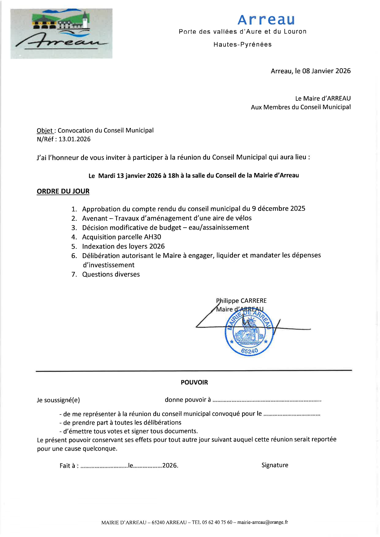 📅 Conseil municipal :13/01/2026 Date du prochain conseil : le mardi 13/01/2026 à 18h à la salle du Conseil de la Mairie d’Arreau